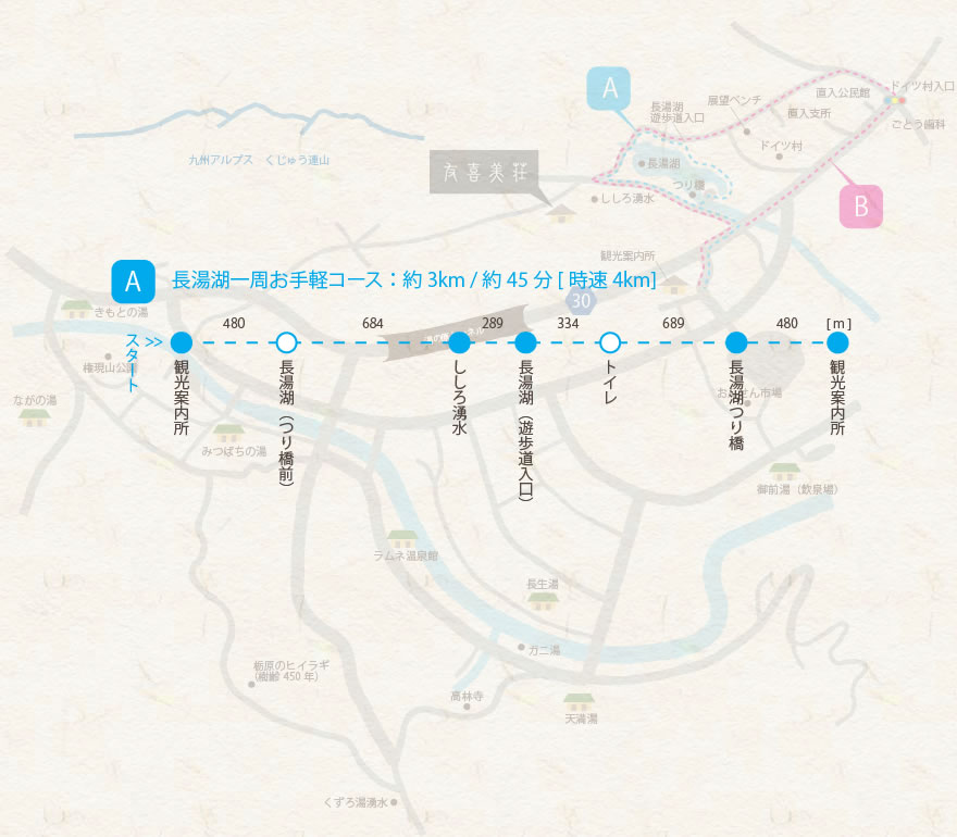 延岡 → 326号線 → 三重町 → 502号線 → 緒方町 → 57号線 → 朝地町 → 442号線 → 長湯温泉